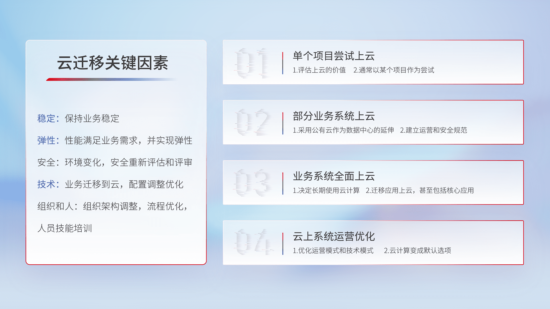 结合实际业务,,,从规划设计、、、、云平台选型、、云原生改造、、、、数据迁移、、集成交付,,迁移全过程为客户识别最佳上云路径,,,,做好风险识别管理,,,设计网络架构、、、、身份权限、、、、安全审计合规、、、、操作审计、、、日志审计、、、、监控告警策略、、多站点容灾设计等,,对云上基础设施进行整体规划,,,提升IT治理水平,,以满足弹性、、高可用、、高性能的需求。。。。