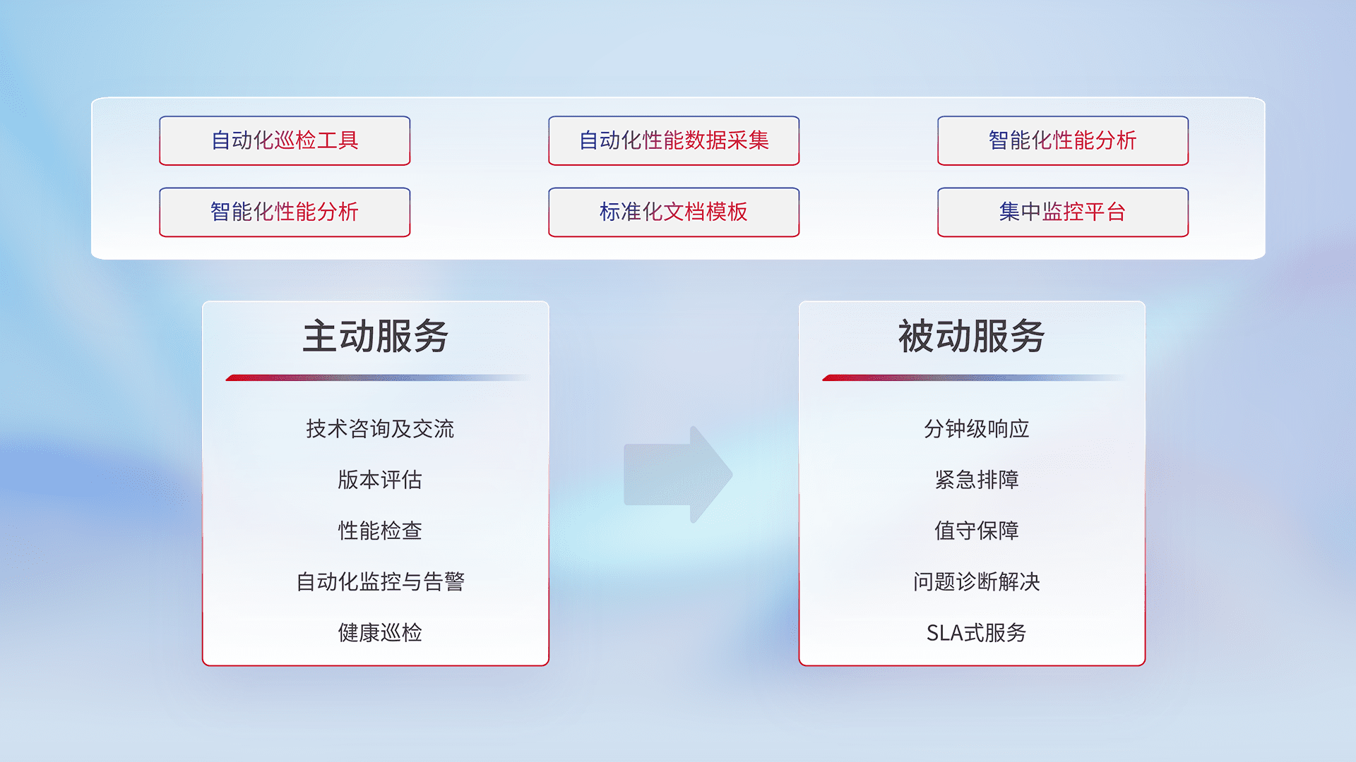 智能化工具和标准化文档,,保障服务质量,,,提供主动服务(包含技术咨询、、、、版本评估、、性能检查、、、自动化监控与告警、、健康巡检)和被动服务包含(分钟级响应、、、、紧急排障、、、值守保障、、问题诊断解决、、、、SLA服务)。。